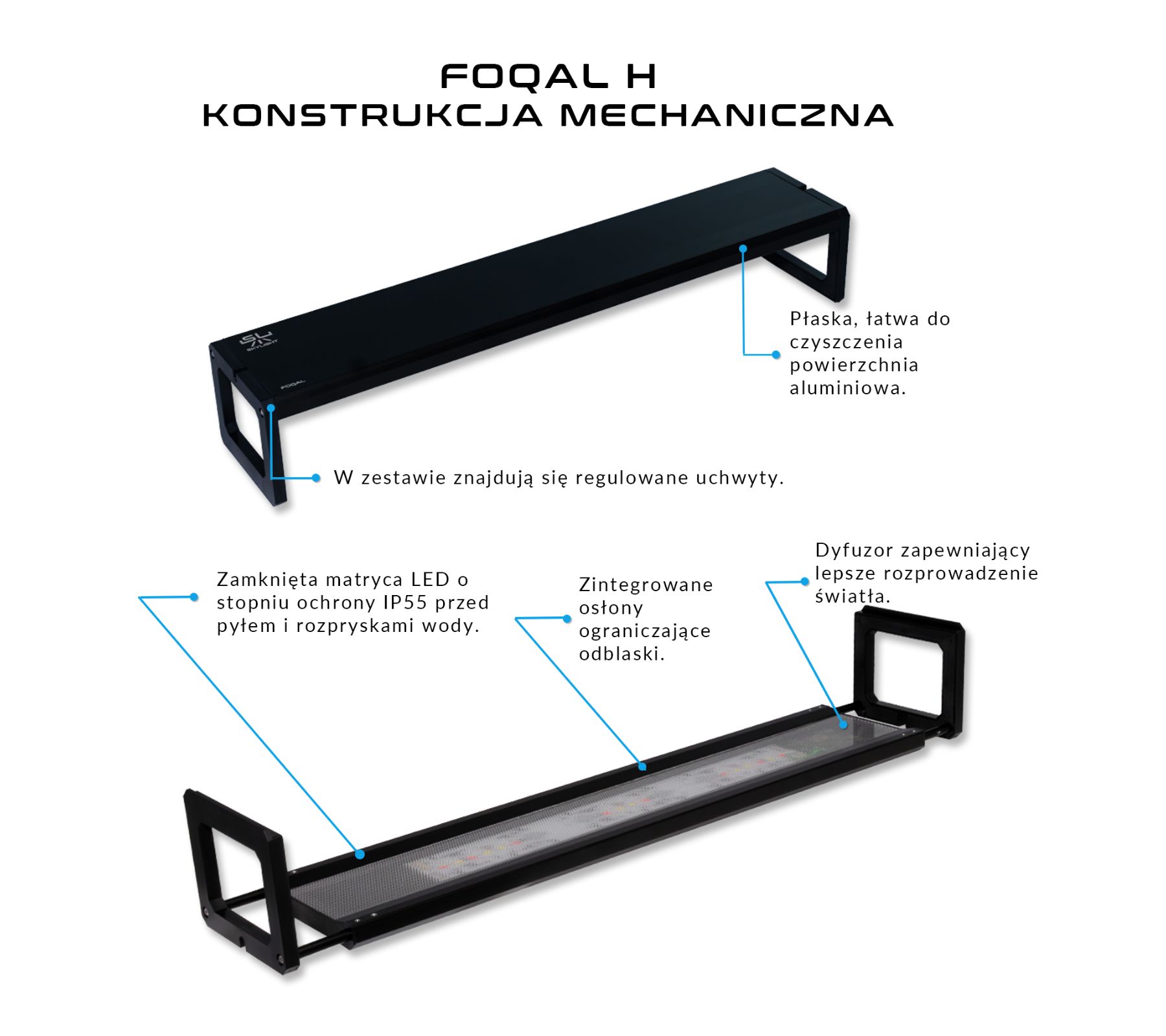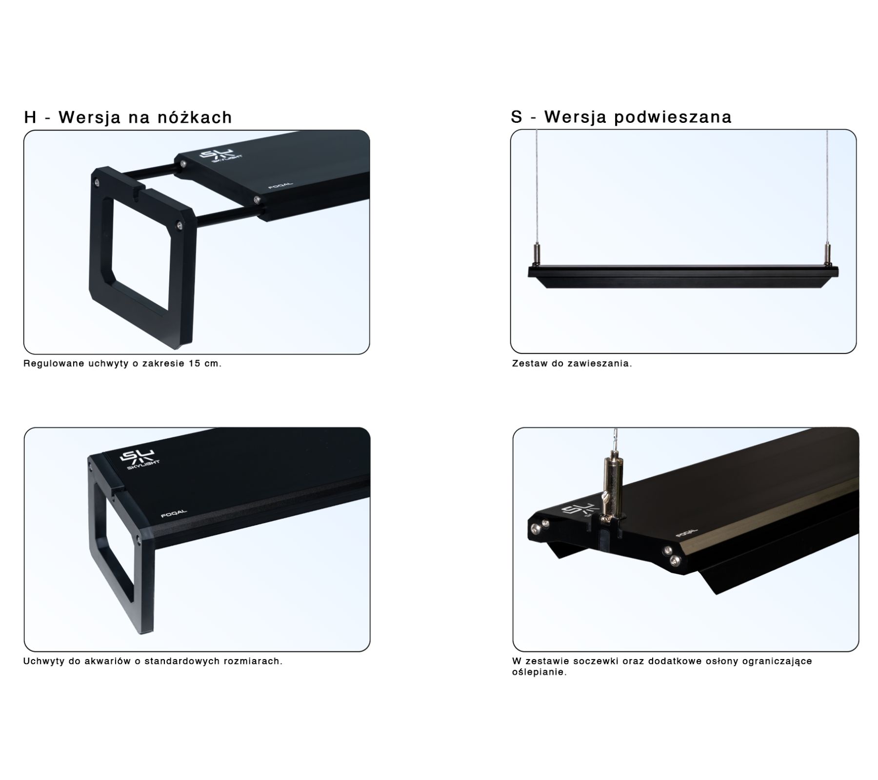 Seria Skylight FOQAL dostępna jest w dwóch wariantach: S oraz H. Obie wersje różnią się przede wszystkim sposobem montażu oraz charakterem rozsyłu światła. FOQAL S to wersja podwieszana, wyposażona w soczewkę 60° oraz dodatkowe osłony ograniczające oślepianie. Taka konfiguracja pozwala precyzyjniej kierować światło do wnętrza akwarium i lepiej kontrolować jego rozproszenie, co szczególnie dobrze sprawdza się w przypadku lampy podwieszonej na większej wysokości nad taflą wody. FOQAL H to z kolei wersja stojąca, wyposażona w soczewkę 120°, która daje szerszy słup światła. Lampa zamontowana na stojaku znajduje się bliżej tafli wody, dlatego nieco szersza wiązka światła kierowanego do akwarium jest bardziej wydajna. Dzięki stworzeniu dwóch wersji lampy klient może wybrać wariant najlepiej dopasowany do charakteru własnego akwarium.