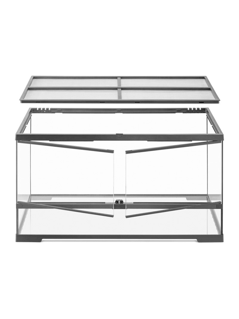 Wyróżniającą cechą terrarium jest opatentowany system blokady górnej pokrywy – zdejmowanej i zabezpieczonej przed przypadkowym otwarciem. Stalowa siatka zapewnia doskonałą cyrkulację powietrza i przepuszczalność promieni UVB – kluczowych dla zdrowia gadów i płazów.