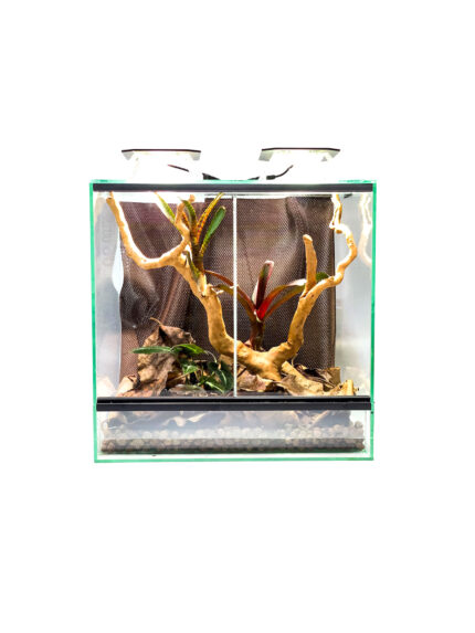 Terrarium for reptiles, amphibians, insects and other small exotic animals. Very comfortable to use, durable and aesthetically pleasing. Features two hinged, independently opening doors with lock as well as a removable mesh cover. Compatible with a wide range of dedicated accessories.