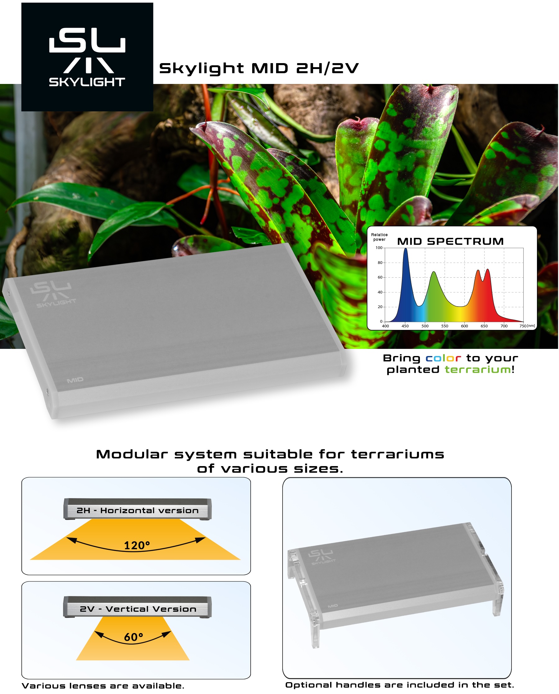 Skylight MID 2 is the new generation of the popular MID series — designed to bring out natural plant coloration and an attractive display of animals in small and medium-sized terrariums, both horizontal (2H) and vertical (2V).